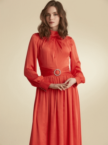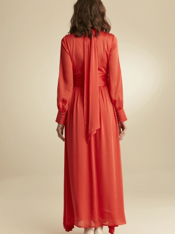 Kemer Tokalı Yakası Fularlı Abiye Elbise - Mercan