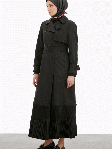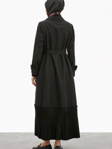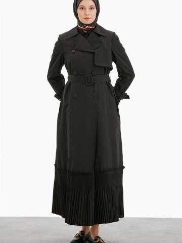 Kruvaze Yaka Piliseli Trençkot - Siyah