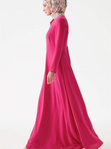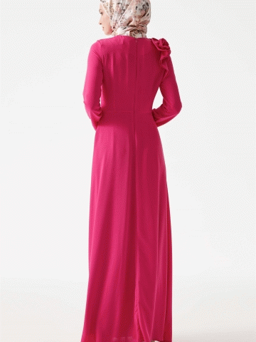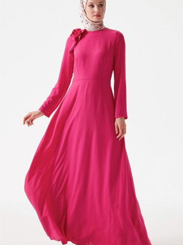 Sıfır Yaka Çiçek Detaylı Elbise - Fuşya