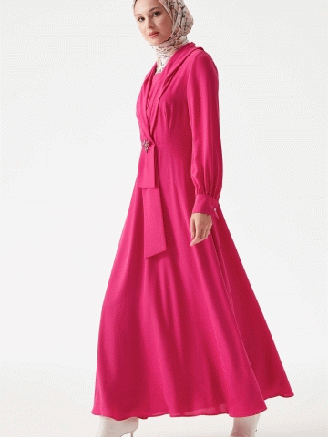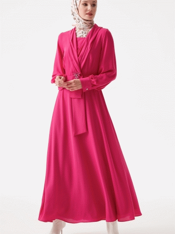 V Yakalı Taşlı Elbise - Fuşya