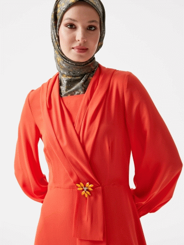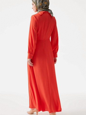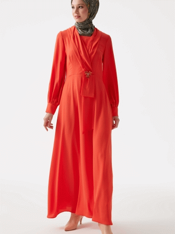 V Yakalı Taşlı Elbise - Mercan