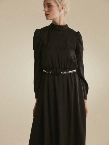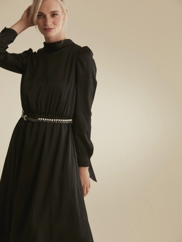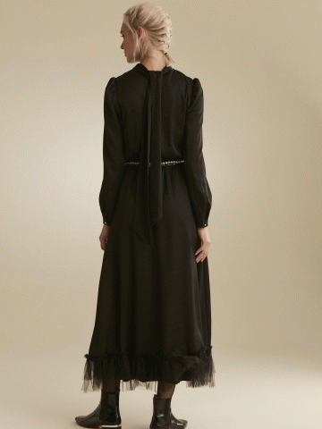 Yakası Fularlı Tütülü Abiye Elbise - Siyah